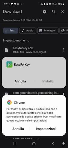 3. Il sistema Android chiederà conferma della volontà di installare un’app esterna al Google Play. Clickare su “impostazioni”